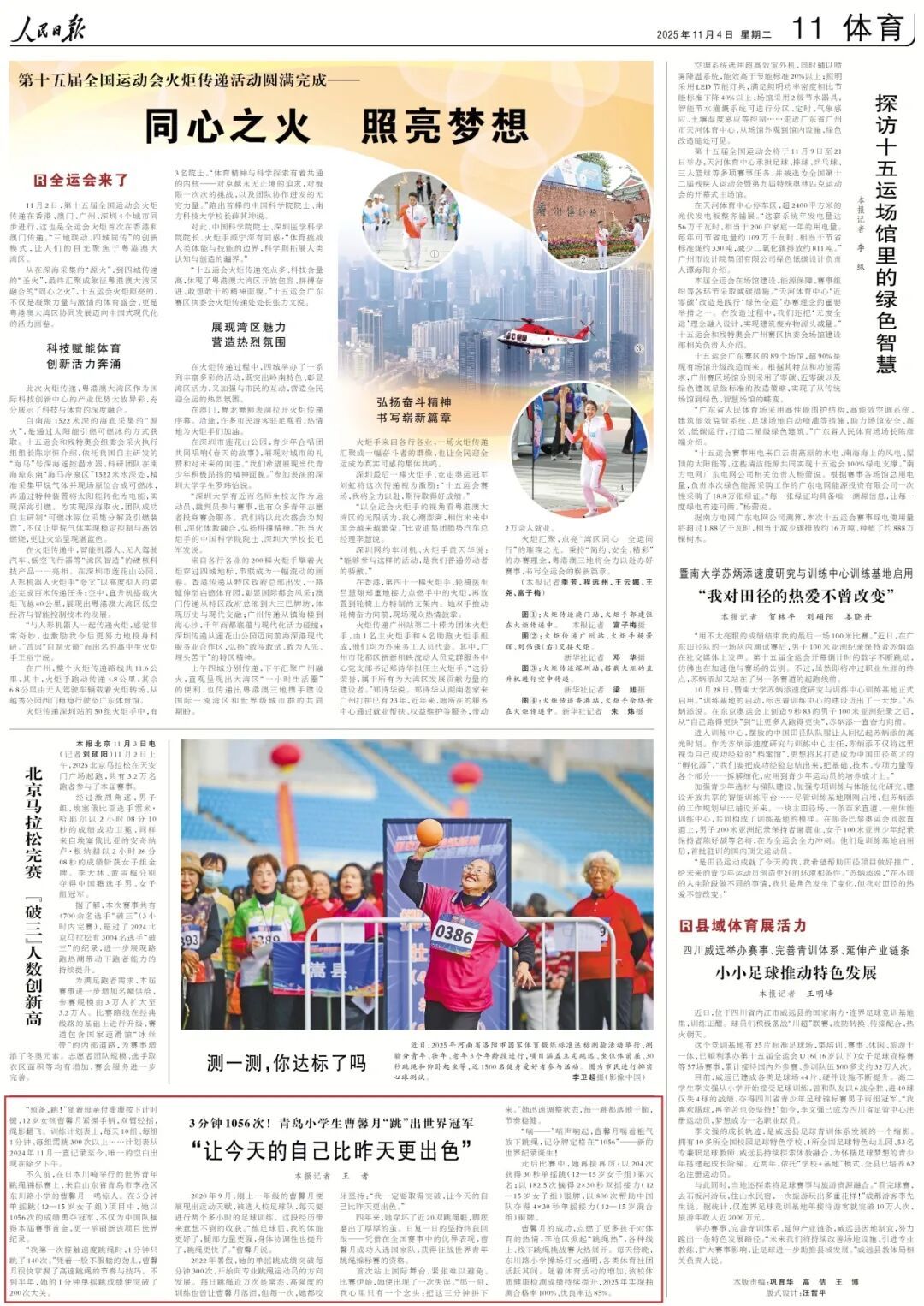 “准备好,跳!”母亲付象山按下计时按钮,12岁的女孩曹新月牢牢握住手柄,手臂轻轻一挥,绳子的影子就飞走了。训练计划每天10组,每组必须1分钟,每组至少跳300次……计划从2024年11月登记至今,唯一的空白出现在除夕下午。不久前,来自山东省青岛市李沧区东川路小学的曹新月在日本川崎举行的世界青少年跳绳锦标赛上受到关注。她以1056跳获得3分钟跳跃(12-15岁女子组)冠军。他不仅为中国队在本次项目上夺得首枚金牌,还刷新了本次项目的世界纪录。 “当我第一次接触快速跳绳时,她一分钟只能跳140次。”凭着一往无前的精神,曹新月很快就掌握了节奏和滑雪ll 高速跳绳。六个月之内,他的一分钟单跳成绩突破了200分。 2020年9月,刚刚升入一年级的曹新月就展现了自己的运动能力,入选了学校足球队。他每天要进行两个多小时的足球训练。天。这段经历带来了意想不到的收获。 “练习足球后,我的体力得到了提高,腿部力量变强了,身体协调性也提高了,跳绳速度也更快了。”曹新月说。高强度的训练,但每次他都咬牙坚持:“今天我一定要有所突破,比昨天更好。”四年来,他已经磨坏了近20双跳绳鞋,脚底也长出了厚厚的老茧。日复一日的坚持终于得到了回报,凭借在全国比赛中的出色表现,曹欣悦入选了国家队,并获得了世界少年赛的参赛资格r 跳绳锦标赛。第一次登上国际舞台,紧张是难免的。比赛一开始他就犯了一个错误。 “那一刻我脑子里唯一想到的就是为这三分钟而战。”他很快就进入状态,每次跳跃都有稳定的节奏。冰块很快就落下来了。哨声一响,曹新月喘着粗气放下了跳绳。记分牌上写着“1056”,新的世界纪录诞生了!在之后的比赛中她继续发力,在单人跳30秒组(12岁至15岁女子组)中以204跳获得第六名。她以182.5的成绩获得2x30第二届双跳接力(12-15岁女子组)的银牌。在4×30秒单人跳接力(12-15岁青少年混合组)比赛中,他以800跳的成绩帮助中国队夺得铜牌。曹新月的成功进一步提高了孩子们对运动的热情。李沧区掀起“跳绳热潮”线上线下推出各类跳绳挑战赛。东川治小学的操场每晚灯火通明,还有几个活跃的体育俱乐部。随着体育活动的增多,学校体质健康检测成绩不断提高。到2025年,飞行考试通过率达到100%,优秀率达到85%。报道来源:人民日报 2025.11.4第11版 人民日报记者 王哲