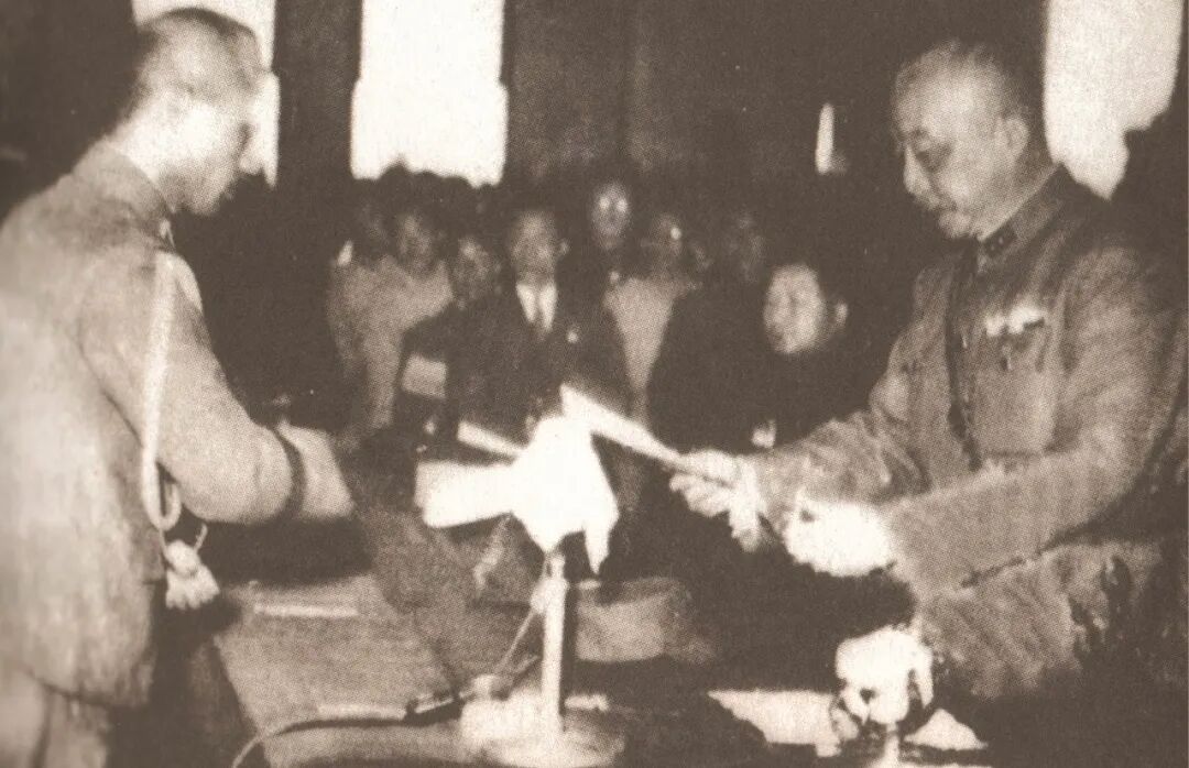 1945年10月25日,中国战区台湾省总司令陈毅(右一)收到日本投降代表团的投降书。照片由中国福建省台湾婚姻博物馆提供